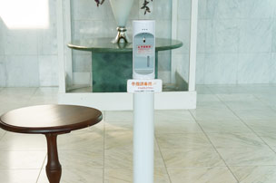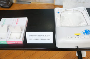 - レストラン会場前にマスク着用とアルコール消毒の徹底の案内モニター設置